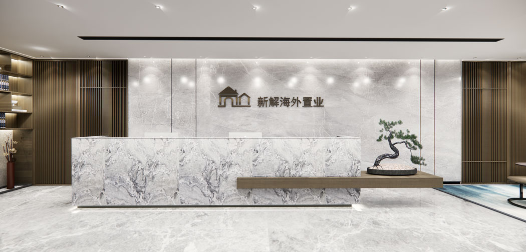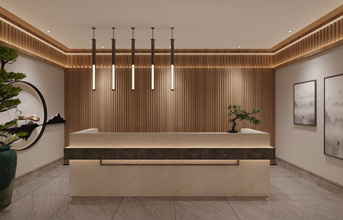 上海裝潢公司案例:與辦公室設計不同,此類空間用灰色石材與木色格柵遙相呼應,彌散出絲絲的東方意蘊,墻面著以燈光嵌入其間,宛如初春的金陵。