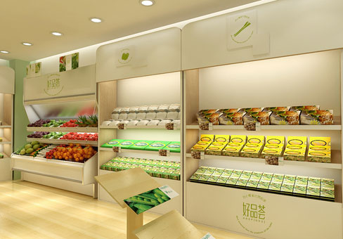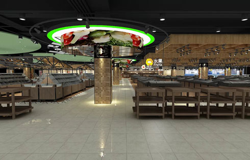 上海公裝公司案例:本案生鮮超市后現代工業風,賣場個性化設計,點睛綠可讓整個空間鮮活起來。