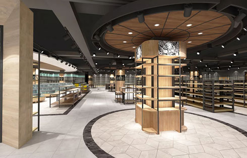 上海裝修公司案例:大空間設計將商品展示以精品室的陳列方式呈現,利用中島式的試吃臺將動線劃分開來。