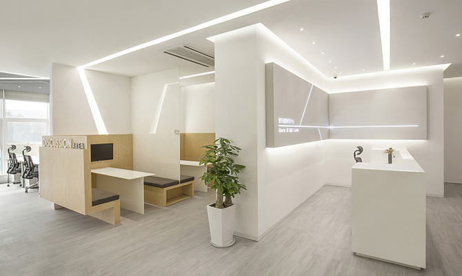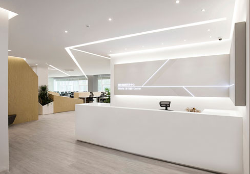 上海辦公室裝修公司案例:簡約白作為全新的品牌色,代表著青春、創造力、活力和創新。線條作為主要元素被用在品牌logo和室內設計中。