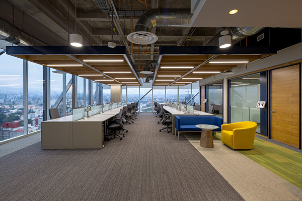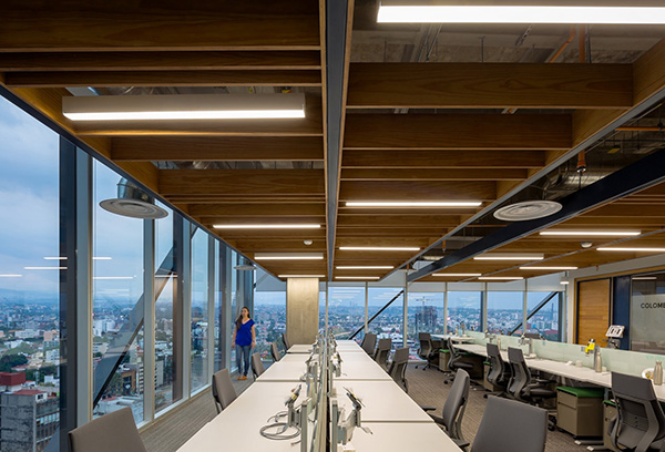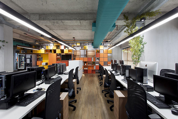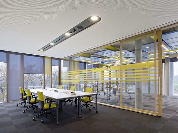 對于大中型辦公空間,常在頂棚有規(guī)律地安裝固定樣式的燈具如格柵燈、筒燈等,以便在工作面上得到均勻的照度,并可以適應(yīng)靈活的平面布局和空間分隔。這種均勻的照度是以滿足辦公書寫為前提 的,但對非辦公區(qū)域則不需要如此高的照明要求,以免增加耗電量造成浪費。
