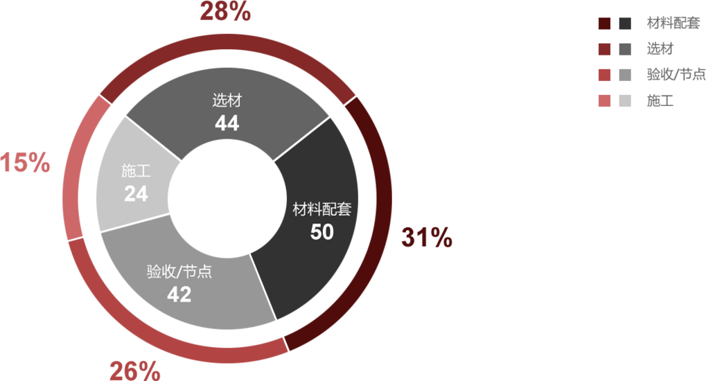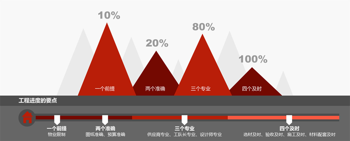 其次是驗收,絕大多數的裝修公司的驗收,只分三次,水電驗收、泥木驗收、竣工驗收。每次驗收時,區區數十分鐘,即驗收通過。這也是很多客戶對裝飾公司不放心,主張第三方監理的原因之一明祺建設就每個工程不低于28次的分項驗收,可分為材料、分項、節點、材料四個方面。我們的施工計劃表中,驗收與節點占到了26%,穿插好每一個驗收于施工進度之中,是考驗一家裝飾公司施工組織的能力。
