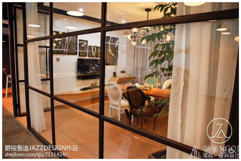我們在入口處使用了鐵件方管與木框結合的設計,滿足陳列功能的同時體現了很好的視覺效果,設計之初還想通過藤蔓植物自然生長的方式讓它更加充滿生機和綠色,同時它起到一個半鏤空的隔斷作用。本案家具統一通過淘寶購買,在滿足設計風格搭配的前提下大量的節約了資金,使得230平方的項目僅僅用了17萬就包含了全部輔材、主材、家具、燈具,業主拎包入駐。