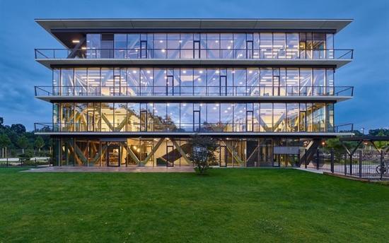 整個建筑的設計猶如一座四層高的玻璃方盒,并且每層樓都圍上了統一裝飾的陽臺。而混凝土柱的設計則為建筑更添特色,以交叉的對角線打破了玻璃幕墻的單一均質,帶來了讓人振奮的工業氣息。