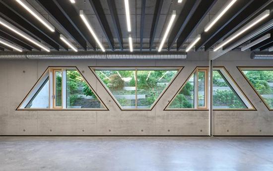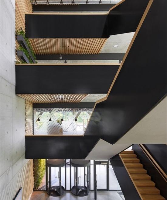 內部的設計就像一個開放式的飛機坪,封閉式的混凝土核心位于室內中心,里面承載了各種服務于技術設施,如急救樓梯、電梯、技術基礎設施和衛生系統。再由中心向外打通了所有樓層,由裸露的混凝土,鋼材以及亞光黑橡木板層打造的樓梯與各樓層相連,整個空豁然開朗。