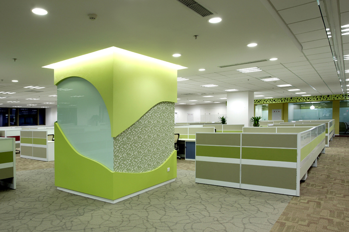 這主要是在大面積的用料上來體現,例如600×600的塊形天花和地毯,已經成為一種辦公室的標識