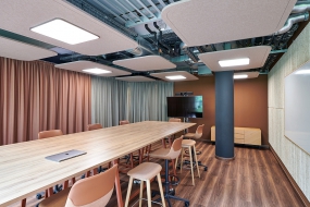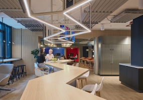 集合式辦公室設計空間在利用上跨越界限,研討區、技術區和茶水間安置在中心地帶,運營成本相對于開敞式辦公室來講,因減少了建筑技術的需求而有所降低,靈活應對格局和交流結構中的變化,連接第二設備區提高地表利用率。