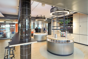 大小不一的開敞式辦公格局設計,由可移動墻和櫥柜劃分區域,開敞式和封閉式房間的交替取決于局部走廊的墻壁,外形軸線與辦公區域的走廊重合,小組和團隊工作模式易于監督,充分利用地表面積,空間連接第二設備區,房間可容納8-25人,近窗區域為高密度工作空間,工作區由走廊相連接,工作區面向儲物區,櫥柜墻通向走廊過道的檔案室,研討區、技術區、重置區的中央安置模式利于溝通交流。
