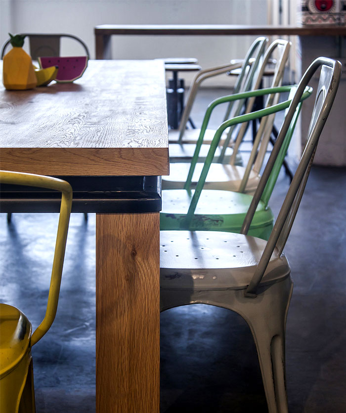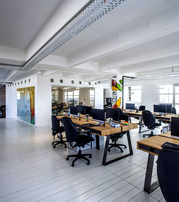 Rosie Lee設計的NIKE倫敦總部辦公室,前臺接待區的手工涂鴉十分的顯眼,這些涂鴉都是以倫敦地區歷史最悠久的標志性建筑為藍本,進行手工繪畫,整個辦公區的色彩并不復雜,盡量用簡單的色彩給員工帶來安靜的工作環境,各式涂鴉和小面積的亮色點綴讓緊張的工作得以放松。