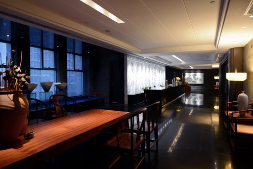 大廳的前臺背景是特地在石材產地挑選的,它如墨如畫淡雅出塵,妙在似與不似之間再配以側邊的水景以及內斂、質樸的中式家具,讓人覺得別有一番韻味,使人產生豐富的遐想無形中透露出中國式的意境之美。