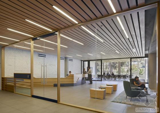 用桉樹板材和木條做成的條帶狀墻面,起始于接待處的桌子那里,進而圍繞著光亮的主入口,延伸到整個區域。彎曲的墻體隔出了長凳區、酒吧區和休息區。大廳的天花板是用隔音的桉木做成的,然后在投資者會談室那里,天花板又變成了動態的平面形狀。與柔軟溫暖的木質元素不同,辦公室的其他區域,則采用的是金屬做成的網狀天花板,還有灰色的帶斑點地毯。